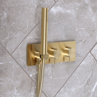 Il miscelatore termostatico in oro satinato per doccia a doppio deviatore della gamma Otto, completo di doccetta e flessibile, conferisce al tuo bagno un look minimal e contemporaneo. Con una struttura in ottone massiccio per una sensazione di lusso e una durata garantita, il miscelatore con deviatore per doccia è dotato di maniglie rotonde facili da usare e utilizza la tecnologia antiscottatura per una doccia sicura e confortevole ogni volta. Abbina a questo miscelatore uno dei nostri soffioni ad effetto pioggia per una doccia rinfrescante come una spa. Caratteristiche: Finitura in oro satinato Doccetta in ottone con flessibile da 1.75m Controllo termostatico della temperatura per evitare scottature e congelamento Maniglie rotonde facili da usare Miscelatore in ottone massiccio con tecnologia a dischi ceramici per prevenire perdite e gocciolamenti Tecnologia antiscottatura per la massima sicurezza e tranquillità Con deviatore