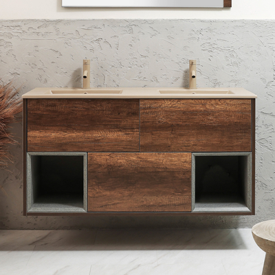 Rinnova il tuo bagno e introduci un tocco ispirato ai colori della natura con il mobile sospeso Hoxton da 1212mm con doppio lavabo Elements. Caratterizzato da un design sospeso a parete per massimizzare lo spazio sul pavimento, questo mobile è ricco di spazio per mantenere il bagno sempre in ordine. The included twin basin features a sand finish for a natural feel & each has a single tap hole & so is perfect for pairing with one of the Hudson Reed mono basin taps to complete & elevate the look. Abbinalo ad altri articoli delle collezioni Elements e Hoxton per un bagno elegante e coordinato. Caratteristiche: Dimensioni dell' Unità: L 1194 mm x P 456 mm x H 600 mm Dimensioni del Lavabo: L 1212 mm x P 465 mm x H 17 mm Legno ingegnerizzato certificato FSC resistente all'umidità con finitura testurizzata effetto rovere scuro Tre cassetti con chiusura ammortizzata e apertura a pressione Due ripiani aperti Doppio lavabo in ceramica resistente con un foro per la rubinetteria e troppopieno Fornito...