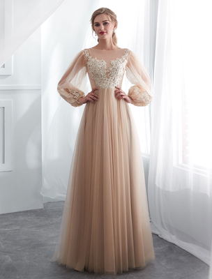 Abiti da ballo champagne Abiti da cerimonia per gli ospiti di nozze con maniche lunghe in tulle di pizzo a maniche lunghe & Matrimonio > Abiti per occasione > Abito da Cerimonia Economico
