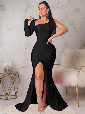 Abiti da festa Abito maxi da ballo irregolare con collo asimmetrico nero e maniche lunghe & Abbigliamento Donna > Abiti > Abiti Party