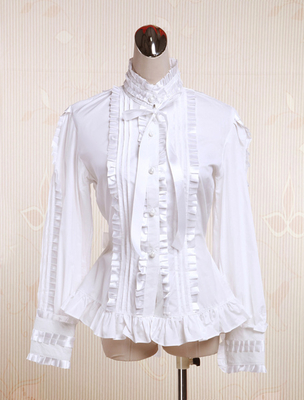 Bianco cotone Lolita camicetta maniche lunghe Stand collare pizzo volant Bow & Vestiti Lolita > Camicette Lolita ...