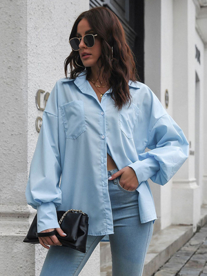 Camicetta per donna Bottoni azzurro cielo Colletto rovesciato Casual maniche lunghe in poliestere & Abbigliamento Donna > Top > Camicie & Camicette