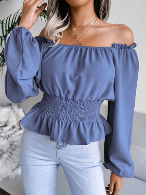 Camicetta per donna Top in chiffon bianco con maniche lunghe a pieghe con scollo a barchetta e spalline aperte & Abbigliamento Donna > Top > Camicie & Camicette