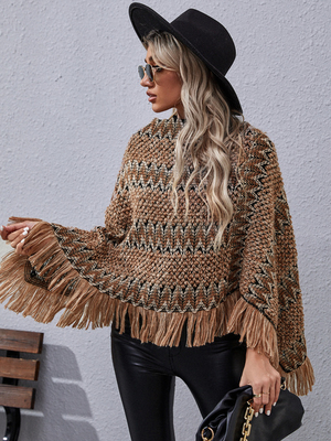 Capispalla caldo da donna con poncho stampato con frange kaki & Abbigliamento Donna > Cappotti > Capo & Poncho & Scialle