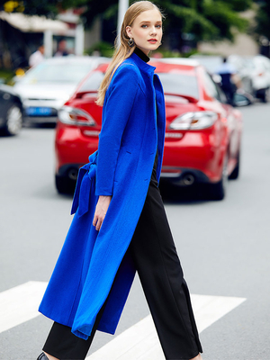 Cappotto lungo in misto lana per donna blu reale con collo alla coreana monopetto con cintura invernale 2025 & Abbigliamento Donna > Cappotti > Cappotti da Donna