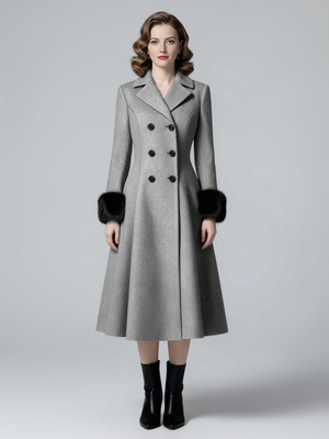 Cappotto midi svasato doppiopetto in misto lana con polsini in pelliccia sintetica nera per donna 2026 & Abbigliamento Donna > Cappotti > Cappotti da Donna