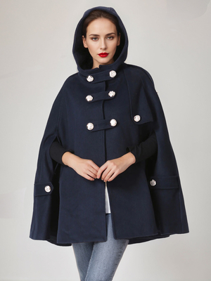 Mantella con cappuccio in misto lana blu scuro Poncho invernale oversize doppiopetto per donna 2025 & Abbigliamento Donna > Cappotti > Capo & Poncho & Scialle