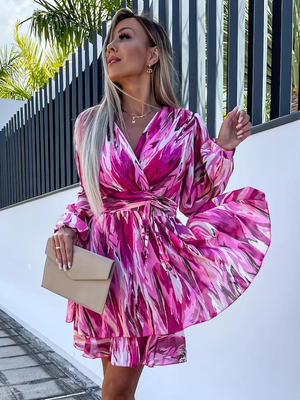 Mini abiti con stampa di abiti corti con cotta e scollatura con cintura e maniche a lanterna & Abbigliamento Donna > Abiti > Vestito Floreale