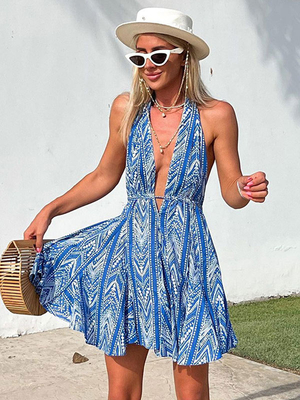 Mini abiti estivi Abito da spiaggia con stampa floreale blu con scollo a V e lacci & Abbigliamento Donna > Abiti > Abiti Bohemia