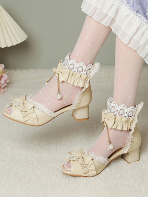 Sandali Lolita stile ROCOCO Scarpe estive Lolita a punta quadrata con fiocchi bianchi ecru pieghettati in pelle PU & Costumi > Abbigliamento Lolita > Scarpe > Sandali Lolita ...