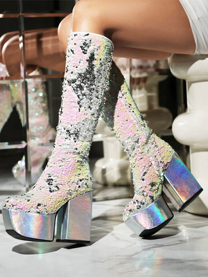 Stivali alti al ginocchio con paillettes Stivali da festa con plateau e tacco grosso da donna & Scarpe > Scarpe Donna > Stivali > Stivali al ginocchio