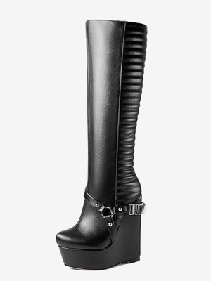 Stivali alti al ginocchio da donna in PU nero chic con fibbia e tacco a zeppa & Scarpe > Scarpe per Occasioni > Scarpe Sexy > Stivali sexy & Stivali balletto