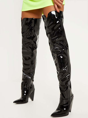 Stivali alti alla coscia con plateau Stivali da donna con tacco a spillo in pelle lucida con punta a mandorla & Scarpe > Scarpe Donna > Stivali > Stivali sopra il Ginocchio ...