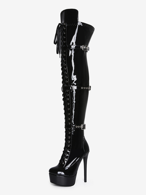 Stivali alti fino alla coscia neri sexy da donna con plateau fibbia lacci e stivali sopra il ginocchio & Scarpe > Scarpe per Occasioni > Scarpe Sexy > Stivali sexy & Stivali balletto
