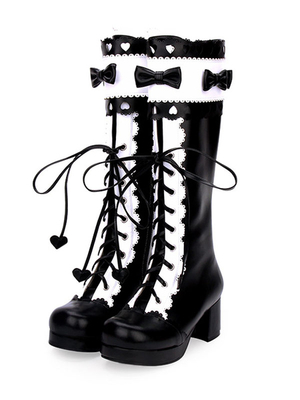 Stivali classici Lolita Lace Up Bow Two Tone Chunky Heel Black Lolita Stivali al ginocchio & Costumi > Abbigliamento Lolita > Scarpe > Stivali Lolita
