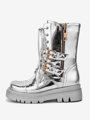 Stivali da combattimento argentati con punta tonda fibbia cerniera lacci stivaletti alla caviglia & Scarpe > Scarpe Donna > Stivali > Stivaletti