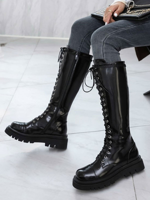 Stivali da donna a metà polpaccio Stivali da donna con cinturino regolabile in pelle nera con punta tonda frontale & Scarpe > Scarpe Donna > Stivali > Stivali per polpacci