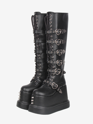 Stivali Gothic Lolita in pelle sintetica con punta tonda e tacco a zeppa neri & Vestiti Lolita > Scarpe Lolita > Stivali Lolita