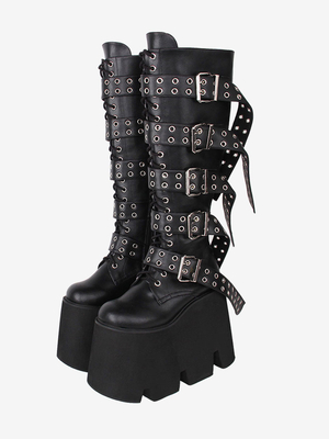 Stivali Lolita gotici Calzature Lolita in pelle PU con punta tonda nera & Costumi > Abbigliamento Lolita > Scarpe > Stivali Lolita ...