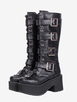 Stivali Lolita gotici neri con punta tonda in pelle sintetica con tacco spesso alti fino al ginocchio scarpe Lolita & Vestiti Lolita > Scarpe Lolita > Stivali Lolita