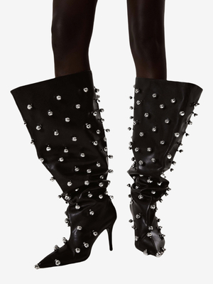 Stivali neri alti fino al ginocchio da uomo con punta a punta perline tacco alto e polpaccio largo & Scarpe > Scarpe Donna > Stivali > Stivali al ginocchio