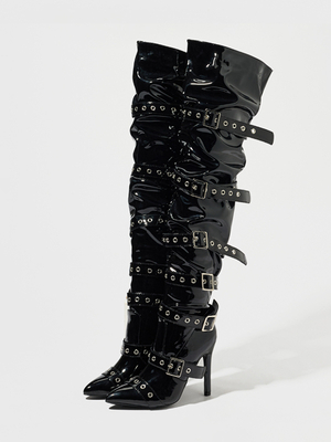 Stivali Neri Sopra Il Ginocchio Con Punta A Punta Fibbie Tacco Alto
