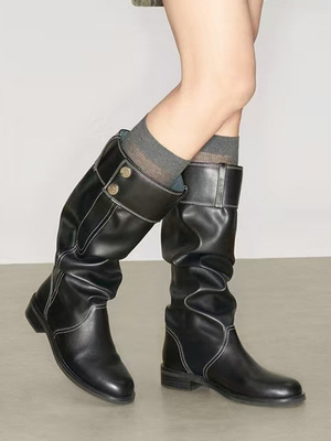 Stivali piatti neri alti fino al ginocchio in pelle PU stivali piatti neri con punta tonda & Scarpe > Scarpe Donna > Stivali > Stivali al ginocchio ...
