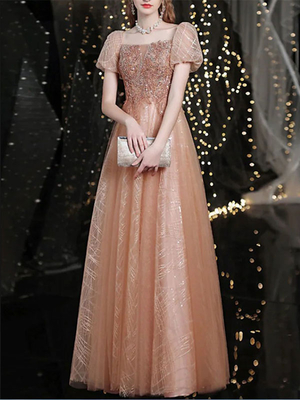 svasata collo squadrato maniche corte di Lacci Ambra a terra & Matrimonio > Abiti per occasione > Abiti da Sera