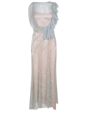 Abito Alberta Ferretti realizzato in poliammide di colore Salvia. Rivestito in pizzo. Sottana in raso di colore Cipria. Scollo diritto. Senza maniche. Dettagli rouches sul petto e sulla manica.100% poliammide Made in Italy