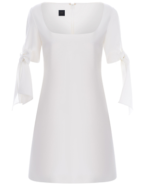 Abito corto Pinko " Verdicchio" realizzato in crêpe stretch di colore Bianco. Maniche corte. Dettaglio fiocco. Scollo squadrato davanti. Linea svasata. Chiusura con zip invisibile al centro sul retro. Foderato. Fodera 64% Acetato, 36% Poliestere 98% Poliestere, 2% Elastan Made in Italy