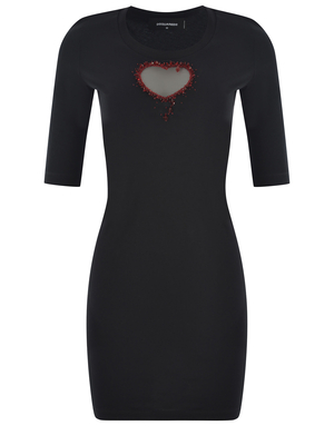Abito Dsquared 2 realizzato in jersey di cotone di colore Nero. Girocollo. Maniche corte. Dettaglio taglio cut out " Cuore" decorato con cristalli di colore Rosso. Lettering " Dsquared 2" stampato a contrasto Bianco sotto lo scollo sul retro. Skinny fit. Applicazione 100% Vetro 100% Cotone Made in Italy