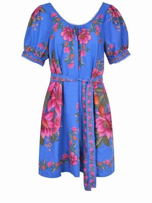 Abito Farm Rio " Summer fruit" realizzato in misto lino di colore Blu. Motivo floreale a contrasto. Scollo ampio. Maniche corte con orlo traforato. Laccio in vita regolabile.55% lino 45% viscosa