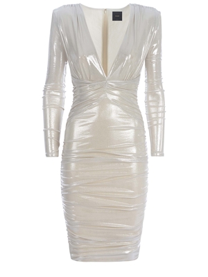 Abito longuette Pinko " Alteo" realizzato in jersey stretch di colore Bianco Perla laminato. Scollo a V. Maniche lunghe. Linea aderente, motivi arricciati. Chiusura con zip invisibile sul retro. Foderato. Fodera 90% Nylon, 10% Elastan 92% Poliestere, 8% Elastan Made in Italy