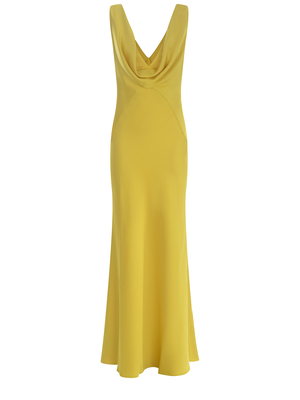 Abito lungo Pinko " Arzigliano" realizzato in raso di colore Giallo. Giromanica. Scollo a V, drappeggiato davanti. Impunture sul bustino che delineano la silhouette. Linea scivolata. Chiusura con zip invisibile di lato. Fodera 100% Poliestere 100% Poliestere Made in Italy