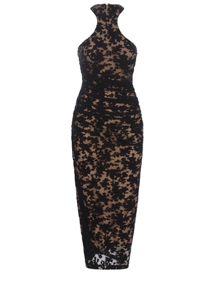 Abito Philosophy realizzato in jersey devoré di colore Nero. Motivo devorè effetto pizzo. Designer con drappeggi. Scollo all'americana. Senza maniche. Foderato. Fodera in tulle stretch di colore Nude. Spacco laterale. Chiusura invisibile con zip sul retro.86% Viscosa, 14% Poliammide