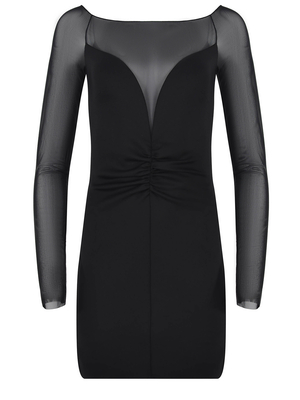 Abito Pinko " Angers" realizzato in tessuto tecnico stretch di colore Nero. Designer con iserti semitraparenti davanti e sul retro. Ampio scollo a barchetta. Maniche lunghe, realizzate in leggero tulle semitrasparente. Chiusura con zip, invisibile di lato. Fit aderente. II Tessuto 91% Nylon, 9% Elastan 80% Nylon, 20% Elastan