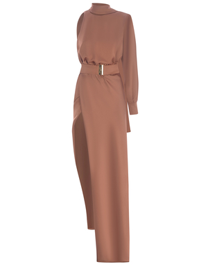 Abito Pinko " Ansonica" realizzato in raso lucido di coloe Bronzo. Girocollo. Monospalla. Giromanica da un lato, manica lunga l'altro. Polso con tre bottoni. Cintura in vita, dettaglio " Pinko" in metallo. Spacco laterale. Chiusura con bottoncino e zip sul retro.100% Poliestere Made in Italy