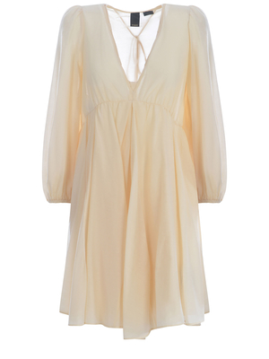 Abito Pinko " Beowulf" realizzato in voile di cotone e seta di colore Avorio. Scollo a V. Profilo con passanti e laccetti con dettaglio in metallo al fondo. Maniche lunghe leggermente a sbuffo. Polsi elastici. Taglio in vita. Gonna linea morbida. 80% Cotone, 20% Seta Abito Pinko " Beowulf" realizzato in voile di cotone e seta