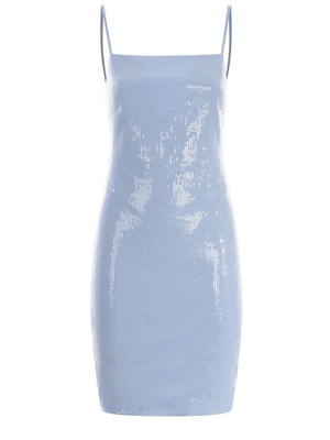 Abito Rotate realizzato in micropailettes di colore Celeste. Spalline sottili, regolabili. Scollo dritto davanti e sul retro. Chiusura con zip invisibile sul retro. Tirante con logo "R".95% Poliestere, 5% Elastan