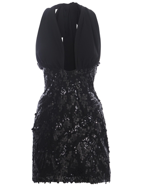 Abito Rotate realizzato con pailettes di colore Nero. Scollo davanti. Chiusura con fiocco che si annoda sul retro. Gonna con pailettes tono su tono. 100% Poliestere