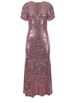 Abito Rotate realizzato in pailettes di colore Rosa. Designer midi. Scollo a punta. Taglio cut-out con bottoncino. Maniche corte. Linea morbida. Chiusura con zip, sul retro. Tirazip con logo "R". Foderato. Fodera 95% Poliestere, 5% Elastan 95% Poliestere, 5% Elastan