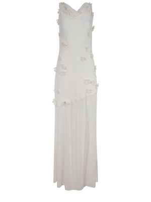 Abito Rotato realizzato in misto poliestere di colore Bianco. Scollo a barca. Senza maniche. Dettagli fiori a in rilievo. Schiena scoperta con dettagli di volant. Spacco laterale profondo. Fondo semitrasparente.55% poliestere 45% poliestere riciclato