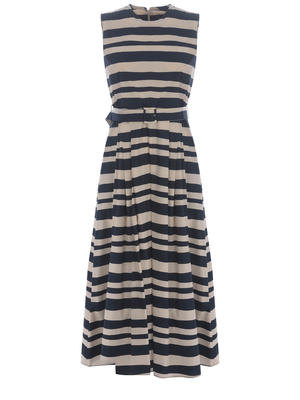 Abito 'S Max Mara " Esmeralda" realizzato in popeline di cotone di colore Crema. Motivo a righe a contrasto Blu Marino. Girocollo. Smanicato. Taglio in vita. Cintura abbinata. Tasche laterali. Chiusura con zip sul retro. Foderato. Fodera 100% Cotone 100% Cotone Made in Italy