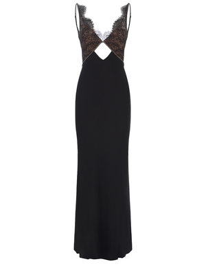 Abito Self-Portrait realizzato in raso di colore Nero. Dettagli in pizzo. Effetto, nudo davanti. Spalline sottili con strass, regolabili. Giromanica. Scollo a V. Taglio cut-out davanti. Scollo sul retro. Gonna fluida in raso di colore Nero. Chisura laterale con zip, invisibile. Fodera 100% Poliestere 100% Viscosa UK 6