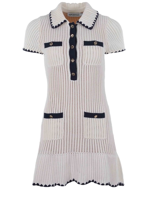 Abito Self-Portrait realizzato all'uncinetto di colore Off White. Inserti a contrasto di colore Blu. Colletto. Maniche corte. Tasche applicate ai lati. Chiusura con bottoni gioiello. Completamente foderato. Orlo svasato. Fodera 59% Viscosa, 38% Pa, 3% Elastan Rifiniture 70% Viscosa, 30% Pes 45% Cotone, 41% Viscosa, 10% Poliammide, 4% Cashmere Scala Taglie UK SIZE 4 6 8 10 12 14 16IT SIZE 36 38 40 42 44 46 48