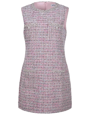 Abito Self-Portrait realizzato in misto lana di colore Rosa. Inserti di colore Nero e Celeste. Girocollo con dettagli in metallo Argento con strass. Senza maniche. Taschini sul petto e tasche laterali con dettagli gioiello. Chiusura con zip sul retro. Foderato.91% poliestere 8% lana 1% fibre metalliche