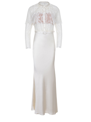 Abito Self-Portrait realizzato in misto poliestere di colore Bianco. Girocollo con strass e perline. Maniche lunghe in pizzo. Dettaglio mantella sul petto in pizzo con laccetti al collo. Chiusura con bottoni sul petto. Gonna in raso. Passanti per cintura. Cintura removibile.96% poliestere 4% elastene