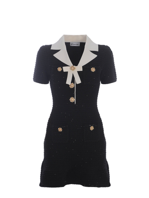 Abito Self-Potrait realizzato in maglia di colore Nero. Inserti con pailettes ricamati. Colletto con fiocco a contrasto Bianco. Maniche corte. Tasche applicate, con bottoni " Gioiello" Dorati. Chiusura con bottoni, davanti. Gonna con balza al fondo. 45% Poliestere, 24% Cotone, 16% Viscosa, 11% Poliammide, 4% Fibra Metallica UK 6