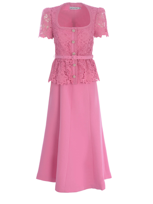 Abito Self-Potrait realizzato in pizzo di colore Rosa. Corpetto aderente. Scollo quadrato. Maniche corte. Bottoni " Gioiello" a pressione davanti. Cintura in vita regolabile, removibile. Designer longuette. Gonna ampia. Chiusura con zip invisibile di lato.100% Poliestere UK 6