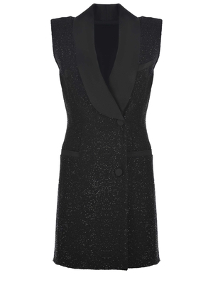 Abito smoking Max Mara " Eiffel" realizzato in raso di misto lana di colore Nero. Motivo micro pailettes tono su tono. Collo con rever sciallato. Taschino sul petto. Chiusura doppiopetto con bottoni, ricoperti. Tasche a filo laterali. Foderato. Silhouette leggermente sagomata. Fodera 85% Acetato, 10% Seta, 5% Poliammide Tessuto decorazioni 100% Poliestere 41% Viscosa, 37% Poliammide, 16% Lana, 5% Poliestere, 1% Elastan